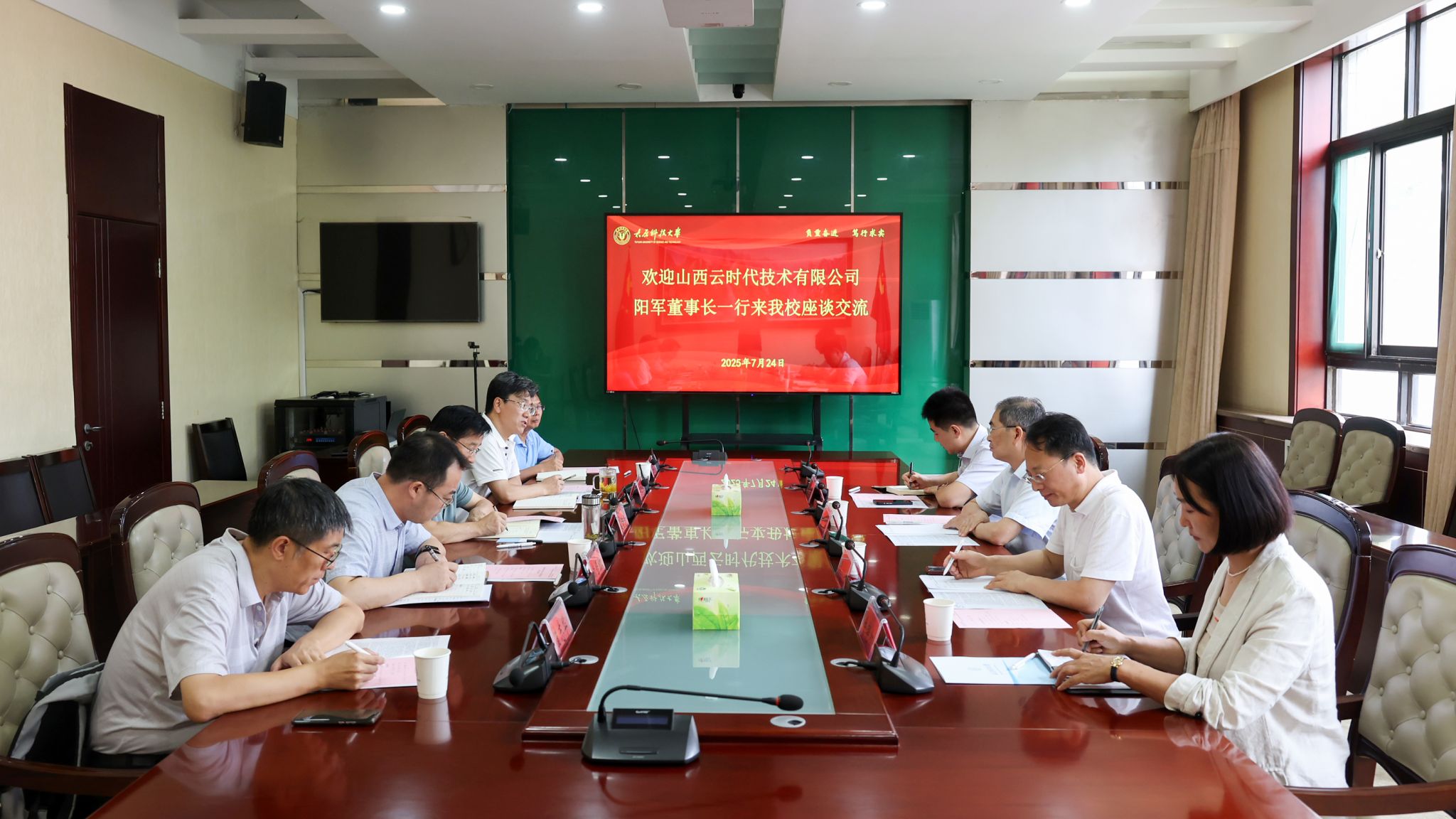 7月24日上午,山西云时代技术有限公司阳军董事长一行4人来校调研交流,推动产学研融合创新,共谋合作新篇章。校党委书记白培康主持召开座谈会。校党委副书记、校长梁卫国,科学技术研究院、教育信息技术中心、计算机科学与技术学院等主要负责同志参加座谈。白培康对山西云时代技术有限公司一行来访表示诚挚欢迎,并对长期以来给予学校的支持表示感谢。他指出,山西云时代技术有限公司作为省属重点骨干企业,是推动我省数字经...