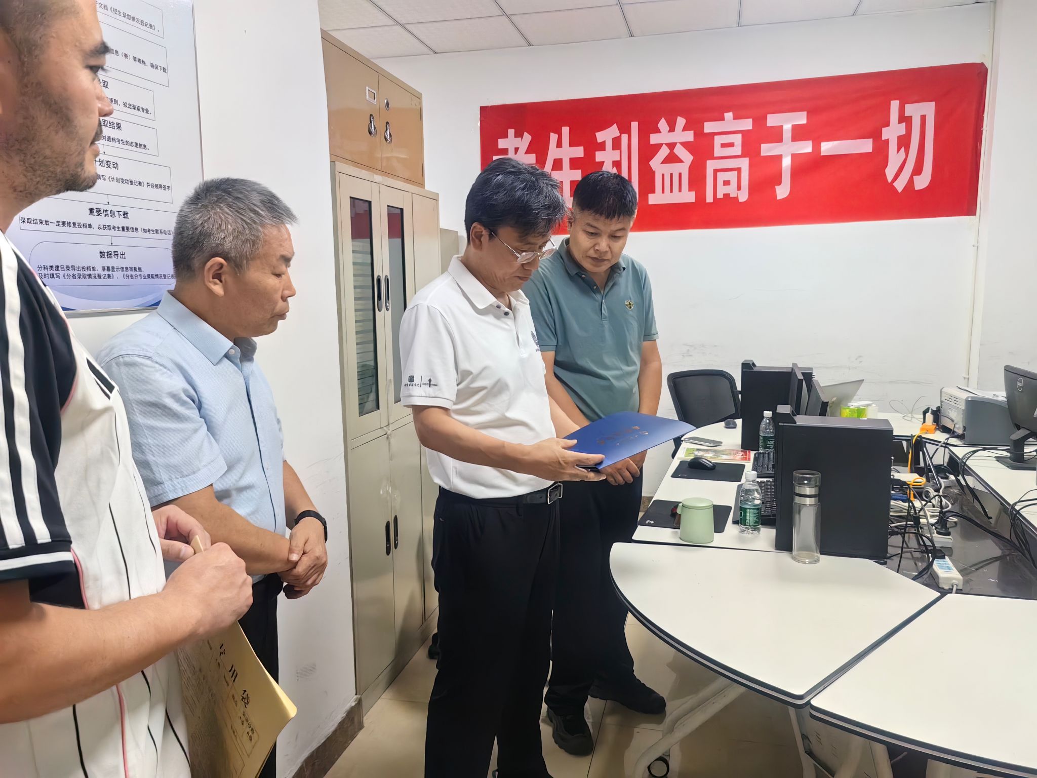 7月31日下午,校长梁卫国深入本科招生录取现场调研指导。校长办公室、教务部负责人参加调研。梁卫国详细了解了2025年本科招生工作的整体进程安排和工作举措,询问了已投档省份的生源质量和新增本科专业招生录取情况,对今年学校在优化招生专业结构、强化招生宣传实效、提升生源质量等方面取得的阶段性成效给予肯定。