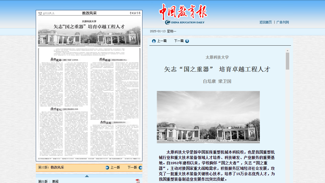 1月13日,《中国教育报》整版刊发威尼斯官网党委书记白培康、校长梁卫国的署名文章《矢志“国之重器” 培育卓越工程人才》。文章从“勇担使命 赓续‘负重’办学特色” “潜心育人 传承工程实践育人特色” “科技报国 把论文写在祖国大地上” “文化立校 传承校训特色文化”四个方面,全方位展现了学校在73年办学历程中,始终胸怀“国之大者”,矢志“国之重器”,在科学研究、人才培养、社会服务等方面为我国重型装备制造业发展作出的...